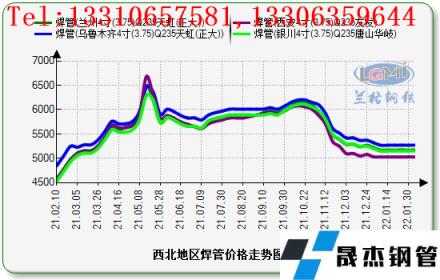 一月份(1.01-1.31),西北地區(qū)焊管鍍鋅管價(jià)格繼續(xù)下跌。云商平臺(tái)監(jiān)測(cè)數(shù)據(jù)顯示,截至2022年1月31日,西安地區(qū)4寸(3.75mm)焊管價(jià)格為5000-5030元,與上月同期價(jià)格持平;蘭州地區(qū)4寸(3.75mm)焊管價(jià)格為5150-5170元,比上月同期價(jià)格下跌50元;銀川地區(qū)4寸(3.75mm)焊管價(jià)格為5130-5150元,比上月同期下跌50元;烏魯木齊地區(qū)4寸(3.75mm)焊管價(jià)格為5190-5270元,比上月同期下跌50元。西安地區(qū)4寸(3.75mm)鍍鋅管價(jià)格為5900-6070元,比上月同期價(jià)格下跌140-240元;蘭州地區(qū)4寸(3.75mm)鍍鋅管價(jià)格為5880-6000元,比上月同期價(jià)格下跌50元;銀川地區(qū)4寸(3.75mm)焊管價(jià)格為5940-6000元,比上月同期下跌50元;烏魯木齊地區(qū)4寸(3.75mm)焊管價(jià)格為6260-6280元,比上月同期上漲40元。