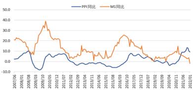 圖1 M1、PPI當(dāng)月同比增速走勢