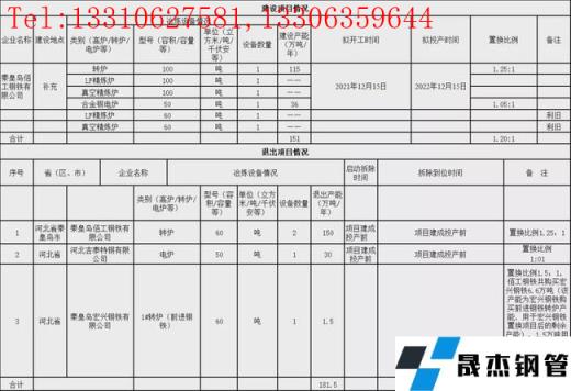 秦皇島佰工鋼鐵有限公司退出60t轉爐2座,產能150萬噸/年;河北吉泰特鋼有限公司退出50t電爐1座,產能30萬噸/年;秦皇島宏興鋼鐵有限公司退出60t轉爐1座,產能1.5萬噸/年。共計退出煉鋼產能181.5萬噸,所有項目將于新建項目建成投產前拆除。