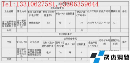 吉林吉鋼鋼鐵集團泰華冶金設備制造有限公司擬于2022年4月在長春市九臺區工業集中區B區新建70t康斯迪電爐1座,產能50萬噸/年,項目預計2024年4月投產。同時計劃退出70t電爐1座,產能50萬噸/年,預計在新項目投產前拆除。