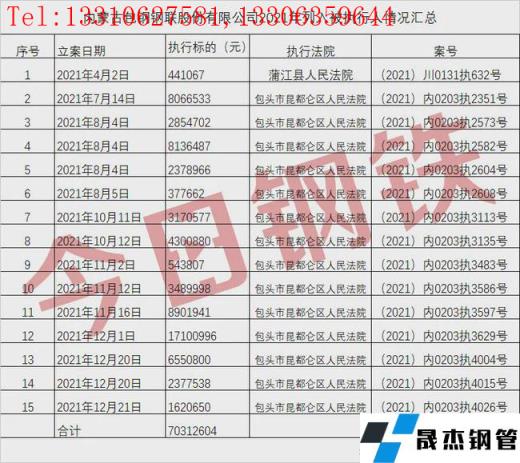 免責聲明:本網站(山東聊城晟杰無縫鋼管廠m.centurybiz.cn)刊載的“超7000萬!包鋼股份年內15次被法院執行!”等均源于網絡,版權歸原作者所有,且僅代表原作者觀點,本文所載信息僅供參考。轉載僅為學習與交流之目的,如無意中侵犯您的合法權益,請及時聯系刪除。本網站刊登此篇文章并不意味著本站贊同其觀點或證實其內容的真實性,我們不對其科學性、嚴肅性等作任何形式的保證。如果侵犯了您的版權,請盡快聯系我們予以撤銷,謝謝合作!