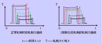 ④ 軋制力曲線臺(tái)階。例如:由于1架輥速過(guò)高、輥縫過(guò)大,2架輥速過(guò)低、輥縫過(guò)小而引起的變形制度不匹配,軋制力曲線異常(如下圖)。