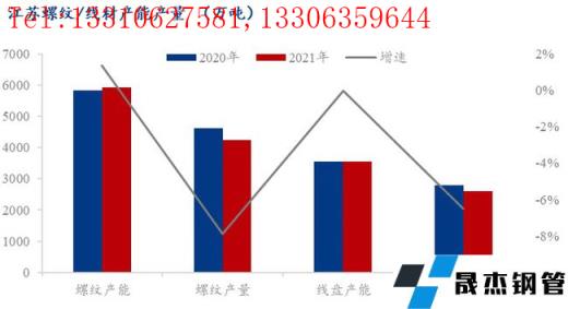 據調研,2021年江蘇省螺紋產能5804萬噸,增加1%。盤線產能3550萬噸,保持不變。螺紋產量4159.88萬噸,同比下降8%,盤線產量2612.8萬噸,同比下降6%。