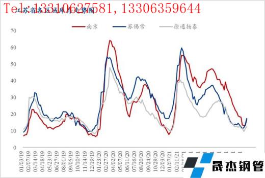 如上圖所示,2020年1月23日省會南京市場庫存占全省現貨庫存的21%左右,屬全年較低水平;而4月9日前后基本占全省庫存的41%;20年上半年南京市場庫存均保持較高水平,而下半年開始庫存便逐漸走低,蘇錫常庫存累庫增加。2021年1月8日南京庫存占全省庫存的24%,從4月初開始到本年度結束,南京庫存占比基本維持在40-42%左右,11月5日占比最高達到年度最高值,約50/%。2021年全年,南京市場庫存均保持較高水平,僅在年初階段,蘇錫常總庫存略高于南京。整體來看,今年南京市場現貨資源一直處于相對充裕的狀態,且部分無縫厚壁鋼管廠家庫存前移也是保證該市場建材供給較為穩定的重要因素,而徐通揚泰區域則因價格波幅巨大,市場參與者主動囤貨意愿不高,全年庫存相較去年小幅減量。