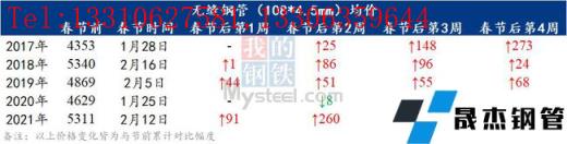小編匯總近5年春節(jié)后四周無縫厚壁鋼管均價變化情況,以供參考。從近5年時間來看,無縫管以上漲為主,只有2020年由于公共衛(wèi)生事件影響,需求遲遲無法啟動,導(dǎo)致價格回落,其他幾年都出現(xiàn)了“開門紅”。