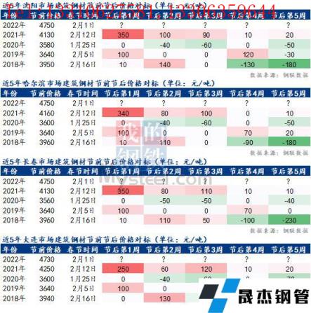 小編匯總了近5年春節(jié)前后東北建筑厚壁無縫鋼管市場價格變化情況,除2020年受公共衛(wèi)生事件影響平穩(wěn)運行外,其余年份節(jié)后首周多數(shù)都是“開門紅”狀態(tài),在第4-5周基本會出現(xiàn)沖高后回調的情況。具體情況如下: