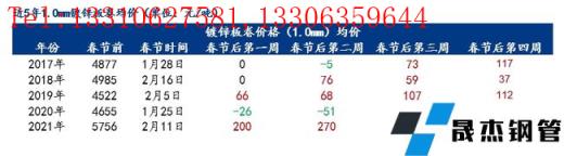 蘇州涂鍍:目前市場流通仍未開工,貿易商預計初八正式上班。2月1日張家港萬達出臺2月份期貨調價信息,跟隨沙鋼熱卷原料出廠價上調幅度150元/噸,萬達鍍鋅卷1.0mm出廠價為5880元/噸,彩涂卷0.47mm出廠價為6380元/噸。無縫厚壁鋼管廠家方面,短流程加工企業部分處于停產狀態,預計需等到2月8日以后復產,其余多數已于今日開始開工。庫存情況,貿易商表示目前庫存相對正常偏高,增加幅度有限,壓力不算太大,據調研統計,預計蘇州涂鍍總體庫存為3.8萬噸左右。節后分析,無縫厚壁鋼管廠家跟隨成本已然上調出廠價格,貿易商將會跟進推高,在下游需求有望逐步回升的節奏中,蘇州鍍鋅卷價格或將早于彩涂卷價格試探上漲,整體節后迎來“開門紅”行情。