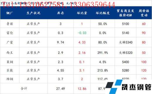 2月7日山東優特無縫厚壁鋼管廠家棒材總庫存27.49萬噸,較節前增加12.86萬噸,增幅88%,較去年春節后庫存減少3萬噸。