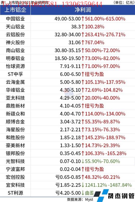 免責聲明:本網站(山東聊城晟杰無縫鋼管廠m.centurybiz.cn)刊載的“23家上市鋁企披露2021年業績預報,超8成凈利潤增長”等均源于網絡,版權歸原作者所有,且僅代表原作者觀點,本文所載信息僅供參考。轉載僅為學習與交流之目的,如無意中侵犯您的合法權益,請及時聯系刪除。本網站刊登此篇文章并不意味著本站贊同其觀點或證實其內容的真實性,我們不對其科學性、嚴肅性等作任何形式的保證。如果侵犯了您的版權,請盡快聯系我們予以撤銷,謝謝合作!