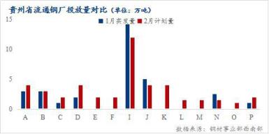 2、2月份貴州省建筑厚壁無縫鋼管資源計(jì)劃投放量45萬噸,較上個(gè)月增加11萬噸萬噸,增幅達(dá)32.35%,主要是2月中旬本地電爐企業(yè)基本復(fù)產(chǎn),資源投放加大,而貴州價(jià)格逐步擺脫洼地,春節(jié)期間省外累庫速度明顯,2月份恐加大對(duì)貴州區(qū)域資源投放。