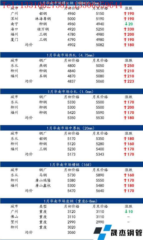 表1:1月華南各品種價格漲跌一覽表 (單位:元/噸)