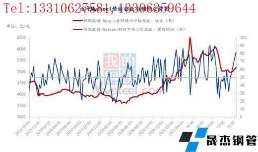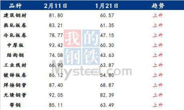 具體各品種指數(shù)來看,2月11日建筑厚壁無縫鋼管情緒指數(shù)為81.8,較1月21日回升21.23;熱軋板卷情緒指數(shù)為83.21,較1月21日回升21.86;冷軋板卷情緒指數(shù)為78.77,較1月21日回升31.62;中厚板情緒指數(shù)為93.42,較1月21日回升33.12;結構鋼情緒指數(shù)為74.08,較1月21日回升30.45;工業(yè)線材情緒指數(shù)為66.9,較1月21日回升3.03;鍍鋅板卷情緒指數(shù)為86.12,較1月21日回升31.32;焊接厚壁鋼管情緒指數(shù)為87.4,較1月21日回升18.53;無縫厚壁鋼管情緒指數(shù)為92.05,較1月21日回升9.66;帶鋼情緒指數(shù)為85.11,較1月21日回升21.62。