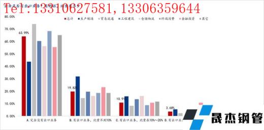 根據對出口企業的主要產品類型調研,46.65%的出口產品為大宗商品及工業原材料等初級產品,28.58%的產品是用于生產加工的中間產品,16.41%的產品是機器設備等資本品及其零部件。同時,出口產品相對穩定,其中增長10%~20%比例為15.01%,增長10%以內的比例為17.98%,約45.69%的出口企業與去年基本持平。