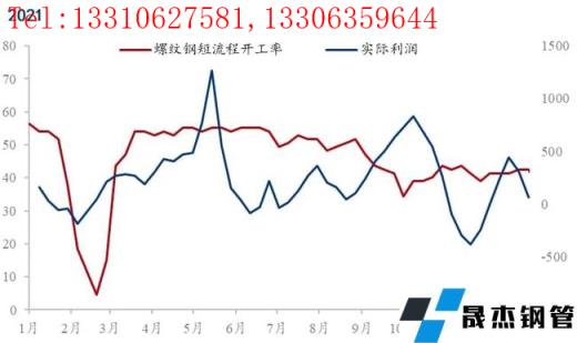 而對于2021年的數(shù)據(jù)來說無論是相關分析還是回歸分析結果表現(xiàn)出與其他年份有不同的結果,這與2021年的特殊情況有關。由于2021年螺紋鋼價格的急劇變化,導致電弧爐實際利潤具有了極強的波動性,而且由于能耗雙控,從8月底電弧爐無縫厚壁鋼管廠家被嚴格限產,導致了電弧爐開工率有近20%左右的持續(xù)下降,創(chuàng)造了歷史低位,政策以及成材價格變動明顯干擾了數(shù)據(jù)的觀測,如下圖所示: