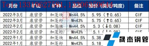 UMK2022年3月對華錳礦裝船報價Mn36南非半碳酸4.7美元/噸度,環比上漲0.2美元/噸度。