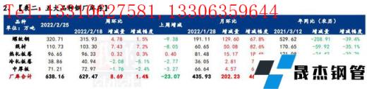 庫存方面,五大品種厚壁無縫鋼管總庫存春節后連續累增四周,環比上周增加94.94萬噸,增幅4.1%。分品種看,建材庫存增加105.78萬噸,增幅為6.9%;板材庫存減少10.84萬噸,降幅1.4%;分指標看,無縫厚壁鋼管廠家庫存環比增加8.69萬噸,增幅1.4%;社會庫存環比增加86.25萬噸,增幅5.2%。