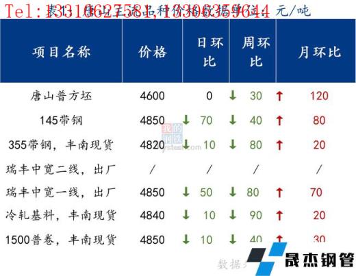 今日唐山管帶價格回落,其中355帶鋼價格較上一交易日跌10元/噸,145帶鋼較上一交易日跌70元/噸,焊管價格跌30元/噸,鍍鋅管價格持穩。市場成交稍有增加,但整體仍然清淡。
