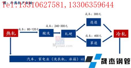 由于熱軋是冷軋的原料,調(diào)研了解有近40%的熱軋被用來(lái)生產(chǎn)冷軋,而且冷熱軋終端需求分布有部分重合,因此冷軋與熱軋價(jià)格走勢(shì)高度類(lèi)似。冷軋板卷是以熱軋卷為原料,在室溫下經(jīng)過(guò)酸洗(費(fèi)用80-120元/噸)、軋制(費(fèi)用240-300元/噸),然后連退(費(fèi)用300元/噸)或罩退(費(fèi)用400元/噸)而成,冷軋成本較熱軋多出620-820元/噸。從下游需求分布來(lái)看,冷熱軋終端需求分布有部分重合,冷熱軋均被用于汽車(chē)、家電業(yè)(洗衣機(jī)、冰箱)以及產(chǎn)業(yè)設(shè)備等。
