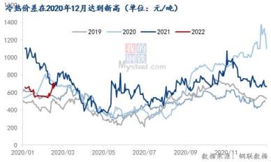去年同期(2021年2月),由于汽車(chē)以及直接出口需求旺盛,冷軋強(qiáng)熱軋弱的局面明顯,冷軋總庫(kù)存累庫(kù)高度同比降幅達(dá)20%,冷熱價(jià)差也拉到新高,月均值達(dá)800元/噸以上。在去年同期冷軋“如火如荼”的行情襯托下,顯得今年的冷軋春天愈發(fā)“寒冷”。