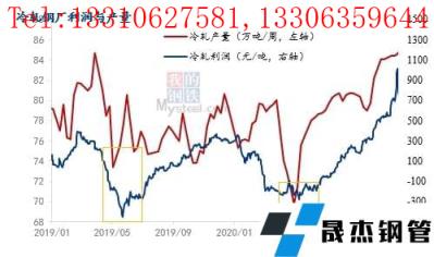 由于考慮到訂單、排產、后續市場情況等多種因素,無縫厚壁鋼管廠家生產計劃需提前制定,因此無縫厚壁鋼管廠家不會輕易減少產量。我們分析歷史情況發現,在虧損較大后,冷軋產量才會有明顯的下降。由于2021年政策影響較大,我們選取2019-2020年冷軋無縫厚壁鋼管廠家的產量和利潤情況發現,產量最低的兩個時間點分別為2019年5月底以及2020年5月底,這兩個時間點對應的冷軋利潤也到達最低點,分別為-450元/噸和-279元/噸。
