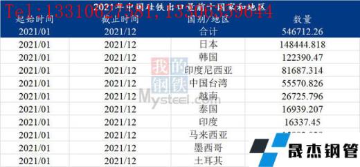 2021年1-12月硅鐵出口總量54.67萬噸,較去年增長97.77%。2021年1-12月硅鐵進(jìn)口總量4.31萬噸,較去年增長88.05%;其中出口日本14.84萬噸,出口韓國12.23萬噸。
