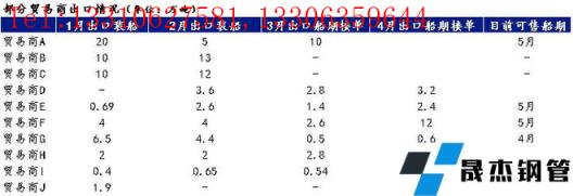 從1月和2月實際裝船量來看,大部分無縫厚壁鋼管廠家都出現(xiàn)了增長,尤其是國營鋼企。在“鋼鐵生產(chǎn)以滿足國內(nèi)需求為主”政策主導(dǎo)下,2021年下半年多家國營無縫厚壁鋼管廠家主動減少鋼鐵產(chǎn)品出口,并且將部分訂單裝船推遲至今年1、2月份。這是導(dǎo)致今年1、2月份實際出口量增加的一個重要因素。目前各無縫厚壁鋼管廠家的接單情況都比較良好,熱軋板卷無縫厚壁鋼管廠家最甚。據(jù)悉各大無縫厚壁鋼管廠家可接訂單船期集中在4-5月,也有部分無縫厚壁鋼管廠家受限產(chǎn)影響 ,4月之后的可出貨量暫無法確定。具體情況如下: