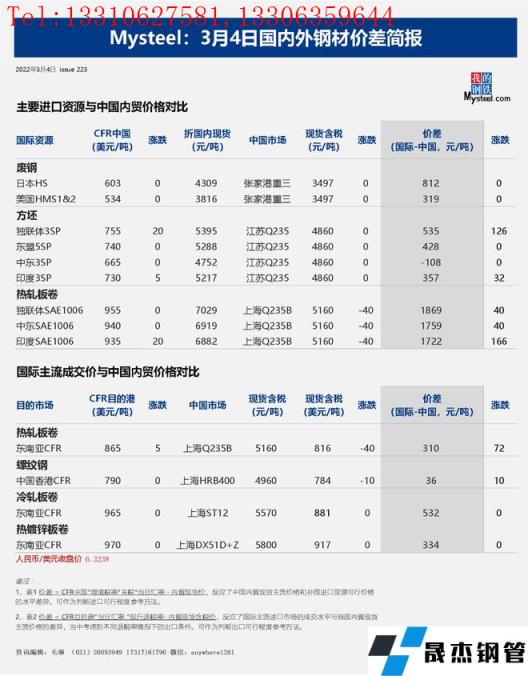 免責(zé)聲明:本網(wǎng)站(山東聊城晟杰無縫鋼管廠m.centurybiz.cn)刊載的“2022年03月04日日報:國內(nèi)外鋼材_無縫鋼管價差匯總(2022.3.4)”等均源于網(wǎng)絡(luò),版權(quán)歸原作者所有,且僅代表原作者觀點,本文所載信息僅供參考。轉(zhuǎn)載僅為學(xué)習(xí)與交流之目的,如無意中侵犯您的合法權(quán)益,請及時聯(lián)系刪除。本網(wǎng)站刊登此篇文章并不意味著本站贊同其觀點或證實其內(nèi)容的真實性,我們不對其科學(xué)性、嚴(yán)肅性等作任何形式的保證。如果侵犯了您的版權(quán),請盡快聯(lián)系我們予以撤銷,謝謝合作!