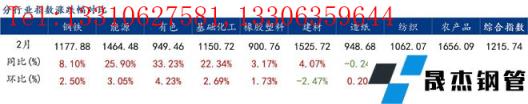 環比來看,2月份鋼鐵、能源、有色、基礎化工、橡膠塑料、造紙、紡織、農產品等8個行業價格指數上漲,僅建材價格指數下跌。