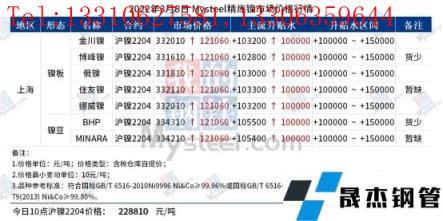 免責聲明:本網站(山東聊城晟杰無縫鋼管廠m.centurybiz.cn)刊載的“鎳價極端行情之下 下游壓力凸顯”等均源于網絡,版權歸原作者所有,且僅代表原作者觀點,本文所載信息僅供參考。轉載僅為學習與交流之目的,如無意中侵犯您的合法權益,請及時聯系刪除。本網站刊登此篇文章并不意味著本站贊同其觀點或證實其內容的真實性,我們不對其科學性、嚴肅性等作任何形式的保證。如果侵犯了您的版權,請盡快聯系我們予以撤銷,謝謝合作!