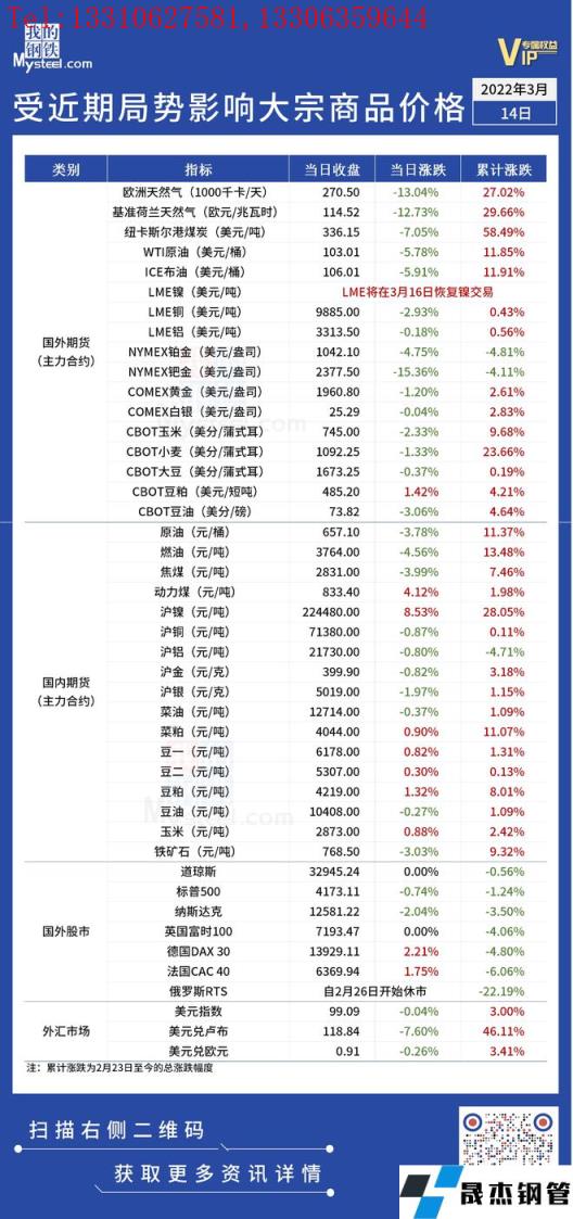 免責聲明:本網站(山東聊城晟杰無縫鋼管廠m.centurybiz.cn)刊載的“受近期局勢影響大宗商品價格一覽表(3月14日)”等均源于網絡,版權歸原作者所有,且僅代表原作者觀點,本文所載信息僅供參考。轉載僅為學習與交流之目的,如無意中侵犯您的合法權益,請及時聯系刪除。本網站刊登此篇文章并不意味著本站贊同其觀點或證實其內容的真實性,我們不對其科學性、嚴肅性等作任何形式的保證。如果侵犯了您的版權,請盡快聯系我們予以撤銷,謝謝合作!