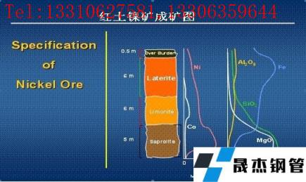 鎳紅土礦通常分三個層次成礦:第一層: 紅土鎳Ni0.9-1.1%Fe45-50%;第二層:鎳褐鐵礦 Ni1.4-1.9%Fe20%-30%;第三層:腐泥土鎳礦Ni2.0-2.6%Fe15%。