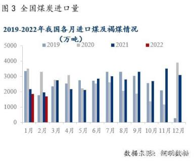 1-2月我國進口煤同環(huán)比大幅下降。2022年1-2月進口煤炭3539萬噸,同比下降14.0%,降幅比上年12月份收窄6.9個百分點。主要是受印尼1月煤炭禁止出口政策影響,影響1月下旬以及2月中上旬我國煤炭進口到港,疫情影響我國288口岸蒙煤通關(guān)量下降至100車左右,導致1-2月我國煤炭進口量同比大幅回落。2月下旬海外地緣沖突爆發(fā),短期對我國進口有一定影響,對2月影響體現(xiàn)不大。
