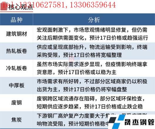 建筑厚壁無縫鋼管:3月16日,全國31個主要城市20mm三級抗震螺紋鋼均價4908元/噸,較上個交易日漲19元/噸。短期來看,在宏觀消息刺激下,市場悲觀情緒明顯修復,或將帶動現貨市場迎來反彈,至于反彈高度,仍需關注后期供需面變化,如北方地區近期高爐集中復產以及疫情對于需求端的影響。因此預期17日國內建筑厚壁無縫鋼管價格或將繼續趨強運行為主。