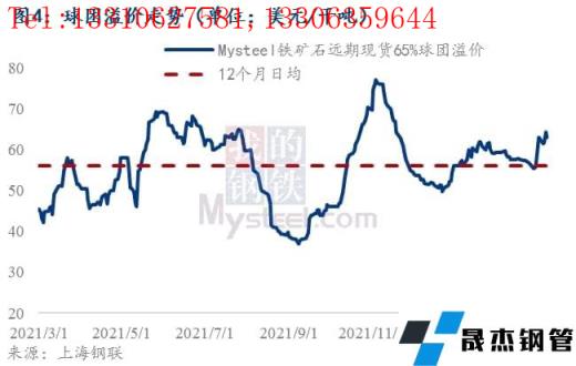 去年8-11月焦炭價格經(jīng)歷大幅度上漲之后,為控制成本無縫厚壁鋼管廠家開始下調(diào)塊礦的入爐配比,導(dǎo)致遠期塊礦溢價最低跌至僅0.0265美元/干噸度,從而性價比凸顯,之后進入四季度隨著采暖季的進行,燒結(jié)限產(chǎn)加嚴,導(dǎo)致燒結(jié)礦供應(yīng)不足,而此時球團溢價又尚處于高位,因此無縫厚壁鋼管廠家在二者選擇中,最終使用性價比較高的塊礦用以彌補燒結(jié)礦不足的影響,帶動塊礦需求好轉(zhuǎn),塊礦溢價開始走高;之后塊礦配比雖有下調(diào),但其配比仍處于歷史中高位水平,因此今年1至3月份塊礦溢價仍持續(xù)上漲。