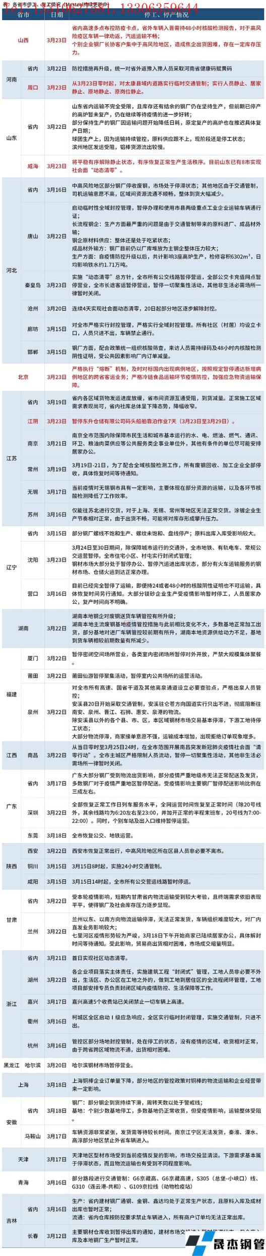截至3月24日,匯總了20個省份停工復工最新信息。其中,3月23日,山西省內高速多點布控防疫卡點,省外車輛入晉需持48小時核酸檢測報告,對于高風險疫區車輛一律勸返,汽運運輸不暢;個別企業無縫厚壁鋼管廠家長協客戶集中于高風險地區,造成焦企出貨困難,存在一定庫存壓力。河南周口從3月23日零時起,對太康縣域內道路實行臨時交通管制;實行人員靜止、居家靜止、原地靜止、原崗位靜止。山東威海于3月23日將平穩有序解除靜止狀態,有序恢復正常生產生活秩序,目前山東已有8市實現社會面“動態清零”。具體情況如下: