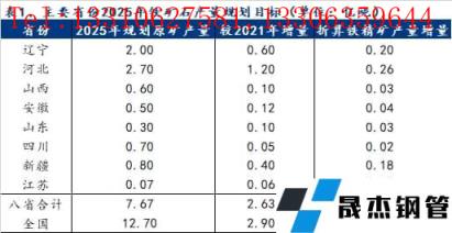 從表1可以看出,全國1億噸鐵精礦增量目標看似宏偉不可及,但分拆到各省來看,這種不可及的心理成分就稀釋了。從八大省份規劃中明確提出的2025年鐵礦石原礦產量目標來看,結合數據,推算出遼寧、河北、新疆三大省份將分別承擔2000萬噸左右鐵精礦的增量任務,這與其儲量現狀,可供開建至成功投產的項目情況是相符的。八大省份2025年比2021年的鐵精礦增量目標加起來已達到0.79億噸,占總目標的93%,再加上其他省份的貢獻,可以說1億噸的增量目標不是喊口號,是有實現思路和方向的。