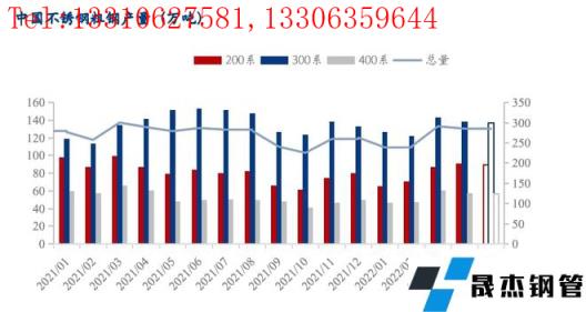 2022年1-4月,國內33家不銹無縫厚壁鋼管廠家(含新增無縫厚壁鋼管廠家江蘇眾拓)粗鋼產量1056.97萬噸,同比減少5.95%,其中200系313.58萬噸,同比減少15.6%;300系530.13萬噸,同比增加4.22%;400系213.26萬噸,同比減少12.45%。
