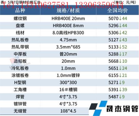 熱軋板卷:5月7日,全國24個主要城市4.75mm熱軋板卷均價5127元/噸,較上個交易日下跌43元/噸。現貨價格維持6日下行趨勢,今日市場成交普遍偏弱,受情緒影響采貨心理不及預期,多謹慎操作,多數商家依舊看弱。預計下周全國熱軋板卷市場呈現持穩的態勢。