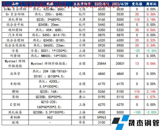 核心觀點(diǎn):上周厚壁無縫鋼管市場整體小幅上漲,五一假期前后,市場存在小幅度的需求放量,疊加節(jié)前現(xiàn)貨成本普遍偏高,因此現(xiàn)貨價(jià)格多數(shù)在節(jié)后小幅上漲;另一方面,市場對(duì)于疫情緩解后的需求釋放情況保持樂觀,因此從預(yù)期方面而言也多以看漲較多;在有色方面,整體下游行業(yè)消費(fèi)不及預(yù)期,銅、鋁上周價(jià)格有所下滑,市場整體呈現(xiàn)較為弱勢。