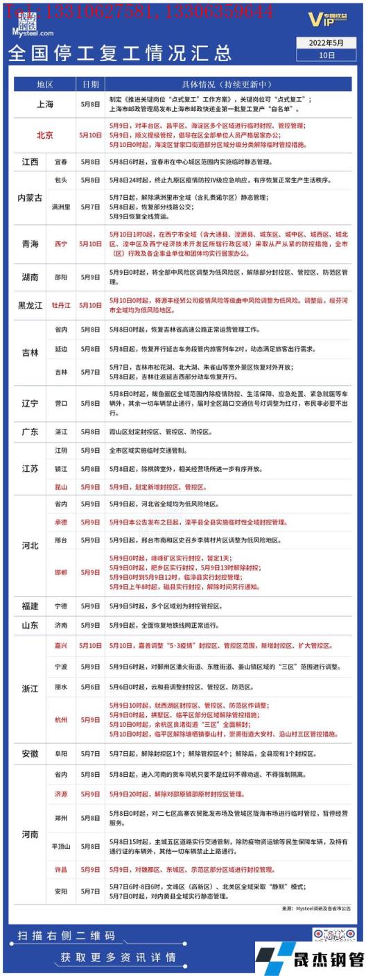 截至5月10日,據(jù)不完全統(tǒng)計,共有17個省份發(fā)布了停工復(fù)工最新信息。5月9日,北京豐臺區(qū)、昌平區(qū)、海淀區(qū)多個區(qū)域進(jìn)行臨時封控、管控管理。邯鄲多區(qū)域?qū)嵭蟹饪毓芾怼?月10日1時起,西寧市全域采取從嚴(yán)從緊的防控措施,全市(區(qū))行政及各企事業(yè)單位和團(tuán)體均實行居家辦公。具體情況如下: