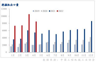 5月10日,中國(guó)工程機(jī)械工業(yè)協(xié)會(huì)發(fā)布對(duì)26家挖掘機(jī)制造企業(yè)統(tǒng)計(jì)數(shù)據(jù),2022年4月銷(xiāo)售各類挖掘機(jī)24534臺(tái),同比下降47.3%;其中國(guó)內(nèi)16032臺(tái),同比下降61%;出口8502臺(tái),同比增長(zhǎng)55.2%。2022年1-4月,共銷(xiāo)售挖掘機(jī)101709臺(tái),同比下降41.4%;其中國(guó)內(nèi)67918臺(tái),同比下降56.1%;出口33791臺(tái),同比增長(zhǎng)78.9%。