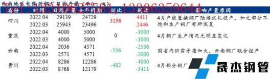 3、云南地區(qū)4月電弧爐無(wú)縫厚壁鋼管廠家日均建筑厚壁無(wú)縫鋼管產(chǎn)量為2036噸,環(huán)比減少536噸,降幅20.83%;同比減少2536噸,降幅55.47%。受省內(nèi)供需矛盾持續(xù)加大,云南無(wú)縫厚壁鋼管廠家聯(lián)合控產(chǎn),其中電弧爐無(wú)縫厚壁鋼管廠家不飽和生產(chǎn),產(chǎn)量環(huán)比小幅下降。