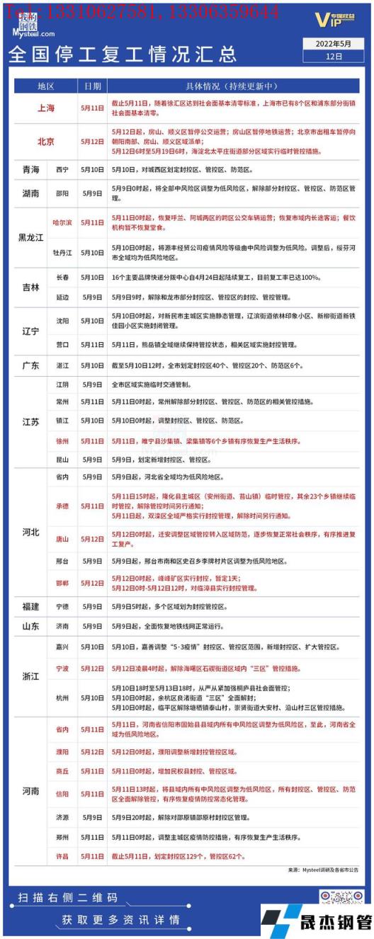 截至5月12日,據不完全統計,共有14個省份發布了停工復工最新信息。5月12日起,北京房山、順義區暫停地面交通運營。河南全域均為低風險地區。唐山遷安有序推進復工復產。具體情況如下: