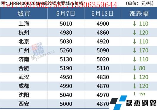 據監測,截至5月13日,全國主要城市20mm三級抗震螺紋鋼均價4956元/噸,較5月7日下跌114元/噸;8.0mmHPB300高線均價5205元/噸,較5月7日下跌101元/噸。