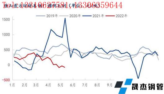 鋼坯盈利情況:本周唐山地區主流樣本無縫厚壁鋼管廠家平均鐵水不含稅成本為3665元/噸,平均鋼坯含稅成本4721元/噸,周環比下調105元/噸,與5月14日普方坯出廠價格4660元/噸相比,無縫厚壁鋼管廠家平均毛利潤-61元/噸,周環比下調45元/噸。