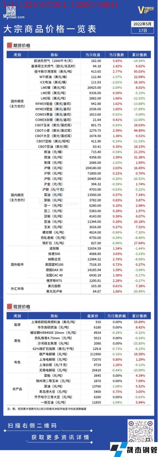 免責聲明:本網站(山東聊城晟杰無縫鋼管廠m.centurybiz.cn)刊載的“俄烏局勢丨大宗商品價格一覽表(5月17日)”等均源于網絡,版權歸原作者所有,且僅代表原作者觀點,本文所載信息僅供參考。轉載僅為學習與交流之目的,如無意中侵犯您的合法權益,請及時聯系刪除。本網站刊登此篇文章并不意味著本站贊同其觀點或證實其內容的真實性,我們不對其科學性、嚴肅性等作任何形式的保證。如果侵犯了您的版權,請盡快聯系我們予以撤銷,謝謝合作!