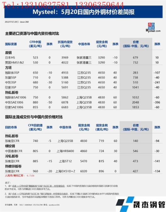 免責聲明:本網站(山東聊城晟杰無縫鋼管廠m.centurybiz.cn)刊載的“2022年05月20日日報:國內外鋼材_無縫鋼管價差匯總(2022.5.20)”等均源于網絡,版權歸原作者所有,且僅代表原作者觀點,本文所載信息僅供參考。轉載僅為學習與交流之目的,如無意中侵犯您的合法權益,請及時聯系刪除。本網站刊登此篇文章并不意味著本站贊同其觀點或證實其內容的真實性,我們不對其科學性、嚴肅性等作任何形式的保證。如果侵犯了您的版權,請盡快聯系我們予以撤銷,謝謝合作!