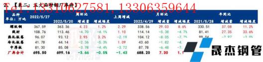 本周延續去庫,其中廠庫降幅略有擴張,擴張主因在于無縫厚壁鋼管廠家加快庫存前移節奏,將庫存轉移至市場,靈活應對市場價格變化,以便及時銷售,回收利潤;社庫降幅環比收窄,收窄主因在于無縫厚壁鋼管廠家雖加快前移布庫,但市場接受度不高,加之鋼價延續弱勢狀態,需求表現不佳,終端采購積極性受到打擊,進而導致庫存去化壓力增加。綜合來看,目前市場心態尚需時間好轉,只能在剛需采購基礎上維持去庫表現。另外,下周迎來端午,加之降水天氣減少,運輸條件改善,部分貿易商少量備庫也能支撐庫存去化。