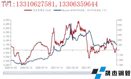 從上述五個(gè)階段,盤面卷螺差在鋼價(jià)上行中更容易走高,在鋼價(jià)下跌中更容易走低(第一階段、第二階段),但也會(huì)出現(xiàn)一定的分化。在第三階段,為貫徹實(shí)施碳達(dá)峰、碳中和,無(wú)縫厚壁鋼管廠家供應(yīng)減少、供需錯(cuò)配,此時(shí)建筑厚壁無(wú)縫鋼管供應(yīng)大幅收縮,雖然鋼價(jià)暴漲,但盤面卷螺差高位震蕩。經(jīng)濟(jì)周期上行時(shí),制造業(yè)需求向好,卷板漲勢(shì)更好;反之在經(jīng)濟(jì)下行周期,制造業(yè)需求萎縮,卷板更多是跟隨建筑厚壁無(wú)縫鋼管趨勢(shì)波動(dòng)。第四階段、第五階段,鋼價(jià)暴跌后筑底反彈,盤面卷螺差則繼續(xù)震蕩走勢(shì),但高點(diǎn)降低,反映了在經(jīng)濟(jì)下行周期,制造業(yè)表現(xiàn)低迷,為穩(wěn)增長(zhǎng)建筑業(yè)表現(xiàn)會(huì)相對(duì)好些。