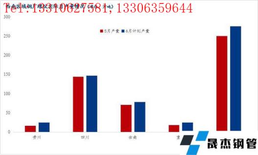 五月西南無縫厚壁鋼管廠家螺紋鋼實際產量250.56萬噸,六月計劃產量275.3萬噸,計劃產量增加24.74萬噸,環比增加9.87%。